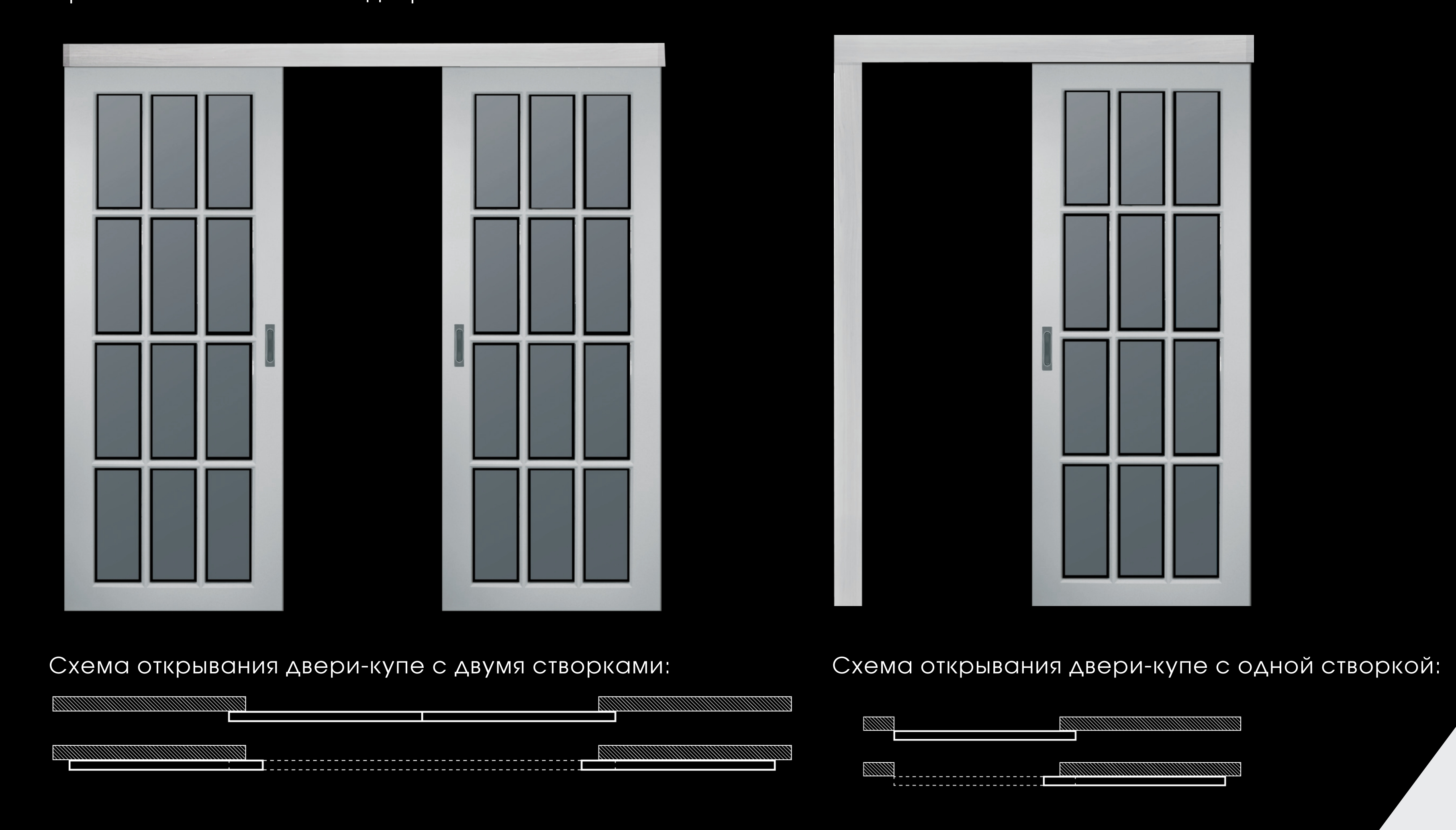 Дверь-купе может быть с одной или двумя створками, расходящимися в розные стороны. Плотно прилегая к стене, оно не зонимоет место, необходимое для распахивания обычной двери.