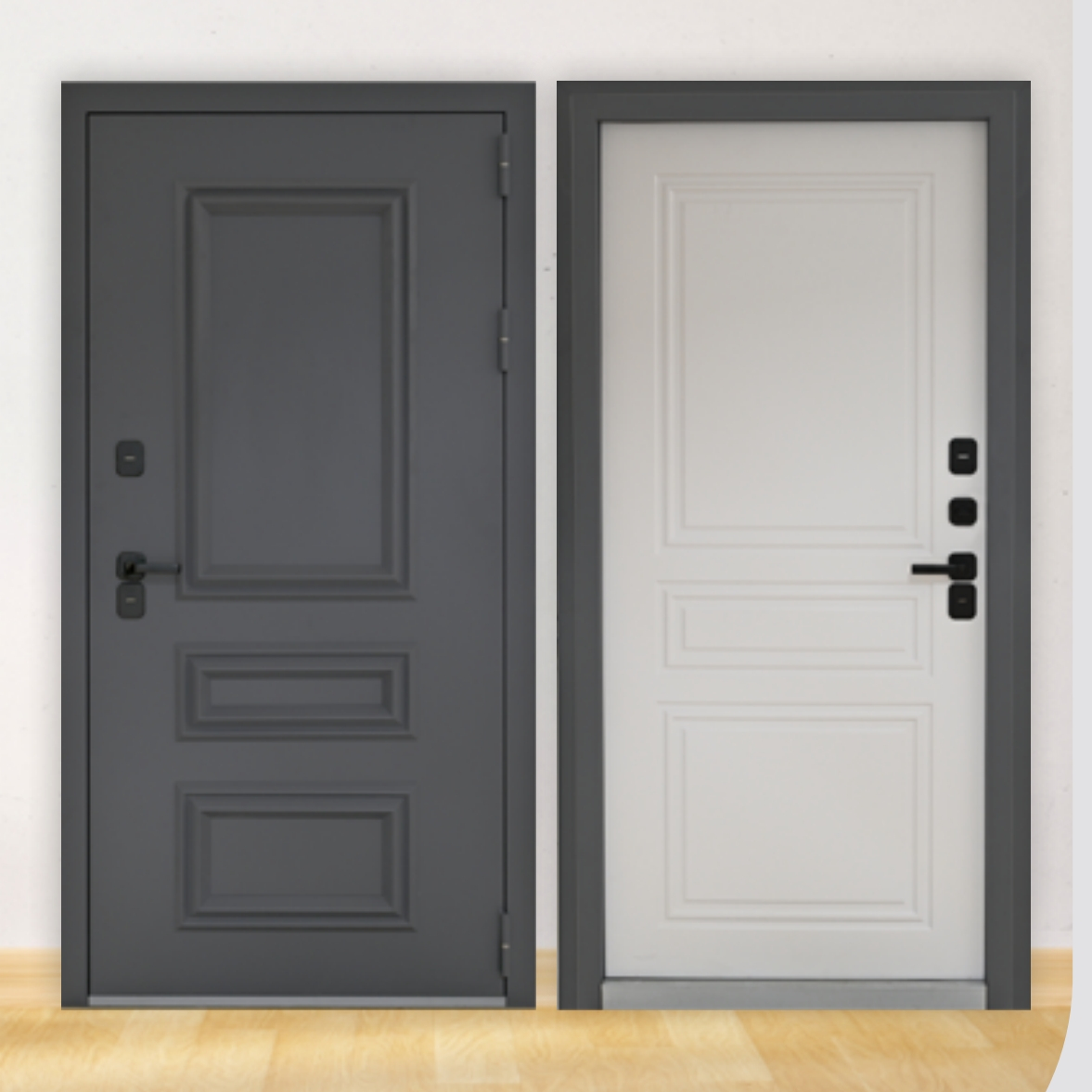 Внешняя отделка:Цинкогрунт серый глянцевый (ПЭ) покрытие со всех сторон полотна+ декоративное покрытие QAL 7024 + Накладной багет, сталь 2,0 мм Внутренняя отделка: Панель 10 мм ламинированная пленкой ПВХ «Велютто бьянко» Толщина металла 1,6 мм Полотно:110 мм, терморазрыв полиамидный профиль Наполнение: плита минераловатная IZOVOL СТ-5Омм + ППС1О-Р-А ГОСТ 15588-2014 + подложка МДФ бмм Петли: З шт.каплевидные 140х20 на подшипнике, с общей допустимой нагрузкой 285 кг. Короб: открытый глубиной 125 мм,З контура уплотнения, терморазрыв 24 мм, полиамидный профиль Наличник:75 мм Основной замок:сувальдный Гардиан 3011 Дополнительный замок: сувальдный Гардиан 3001 Комплектация: ночная задвижка, фурнитура черная прямоугольная 17 серия, декоративные накладки с защитой от продувания, порог с накладкой из нержавеющей стали, комплект ключей. Размеры: 860х2060 мм! 960х2060 мм