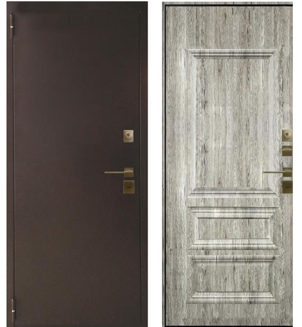 Двери с системой терморазрыва на полотне и коробе. Терморазрыв выполнен благодаря термомостам из стеклонаполненного полиамида СТН-2169 Внутренняя отделка, влагостойкий МДФ, рисунок "Айдахо" в пленке "Рустик пепельнный", Внешняя отделка Металл с полимерно-порошковым покрытием толщиной 2мм "Муар Картен". Утеплитель: Минеральная плита KNAUF Insulation(негорючий и экологичный), и два дополнительных термоизолирующих слоя «Изодом». Три контура трубчатого уплотнителя. Защита наружной части полотна: специальный грунт от компании AkzoNobel, благодаря которому на его поверхности создается защитная пленка, и атмосферостойкая краска AkzoNobel препятствуют возникновению коррозии, делают полотно устойчивым к атмосферным воздействиям. Дверная коробка: Усиленная профильная конструкция открыто-закрытого типа с терморазрывом. Дверное полотно усилено ребрами жесткости, замковый карман. Толщина полотна - 100 мм. Толщина коробки - 117 мм. Петли Сombiarialdo - СА® (Италия), 14 (высший) класс, с повышенной нагрузочной способностью Противосъемные внутренние фиксаторы. Основной замок: Аргус 512 М (Россия), гарантия 7 лет (4 ключа). Дополнительный замок: Аргус 501 (Россия) ЦИЛИНДРОВЫЙ, , гарантия 7 лет , Цилиндр «Гардиан» или "Фуаро" с терморазрывом . Ночная задвижка. Фурнитура: Армадило, Ручка Армалило Мираж- на квадратной основе. Цвет фурнитуры: Вороненый никель . Внутренняя часть короба в цвет панели. Порог из нержавейки. Размеры: 870х2050, 970х2050. по коробу.