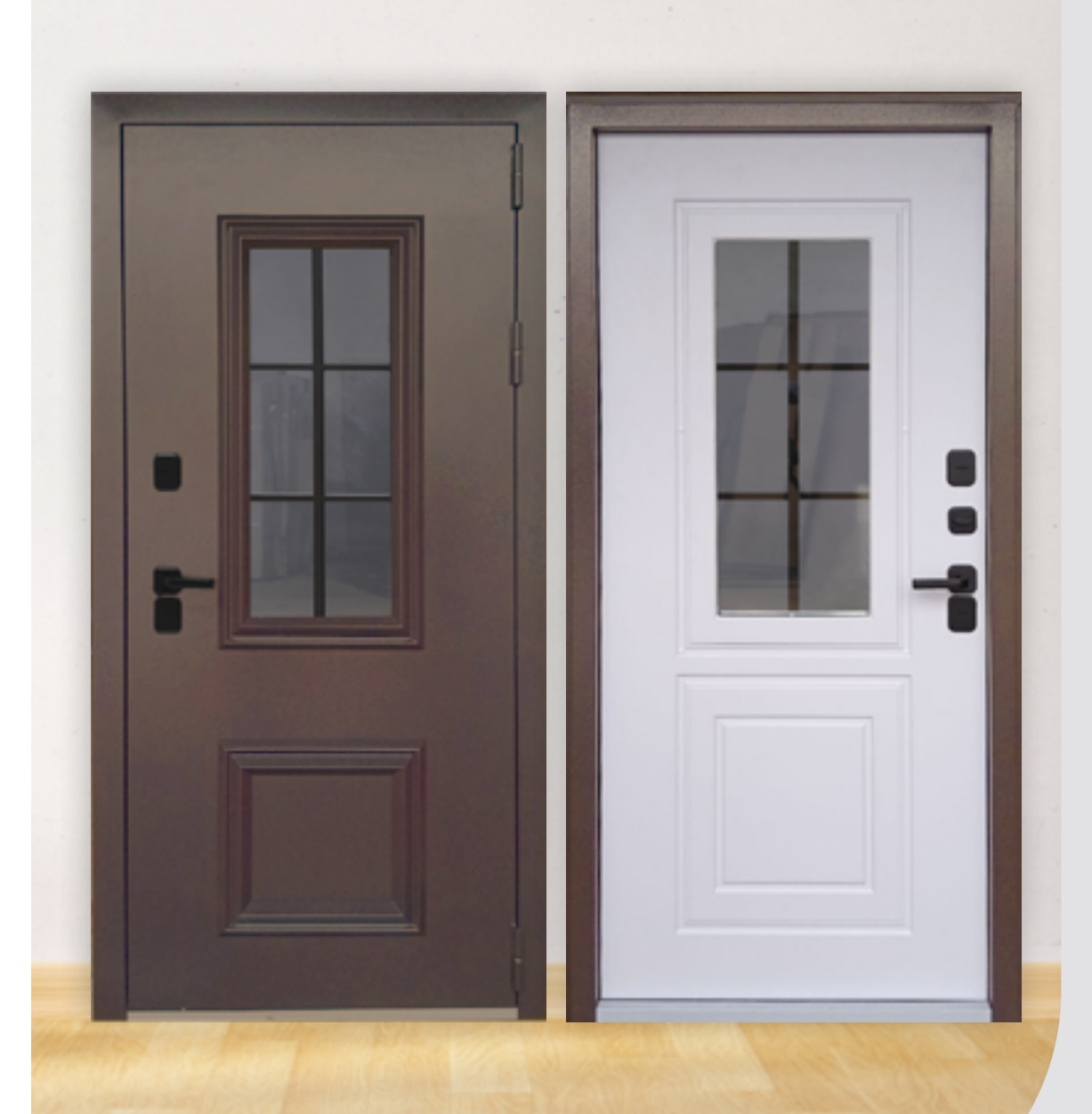 Внешняя отделка: Цинкогрунт «Букле опал» покрытие со всех сторон полотна • декоративное покрытие • Накладной багет, сталь 2.0 мм Внутренняя панель:панель 10 мм ламинированная пленкой ПВХ «Велютто бьянко» Толщина металла:1,6 мм Полотно:110 мм терморазрыв полиамидный профиль Стеклопакет:2-х камерный толщиной 60 мм Наполнение:плита минераловатная IZOVOL СТ-ЮММ + ППС1О-Р-А ГОСТ 15588-2014 + подложка МДФ Бмм Петли:З шт.каплевидные 140х20 на подшипнике, собщей допустимой нагрузкой 285 кг Короб: открытый глубиной 125 мм,3 контура уплотнения, терморазрыв 24 мм, полиамидный профиль Наличник:75 мм Основной замок:сувальдный Гардиан 3011 Дополнительный замок:сувальдный Гардиан З001 Комплектация: ночная задвижка, фурнитура черная прямоугольная 17 серия, декоративные накладки с защитой от продувания, порог с накладкой из нержавеющей стали, комплект ключей. Размеры:860х2060 мм,' 960х2060 мм
