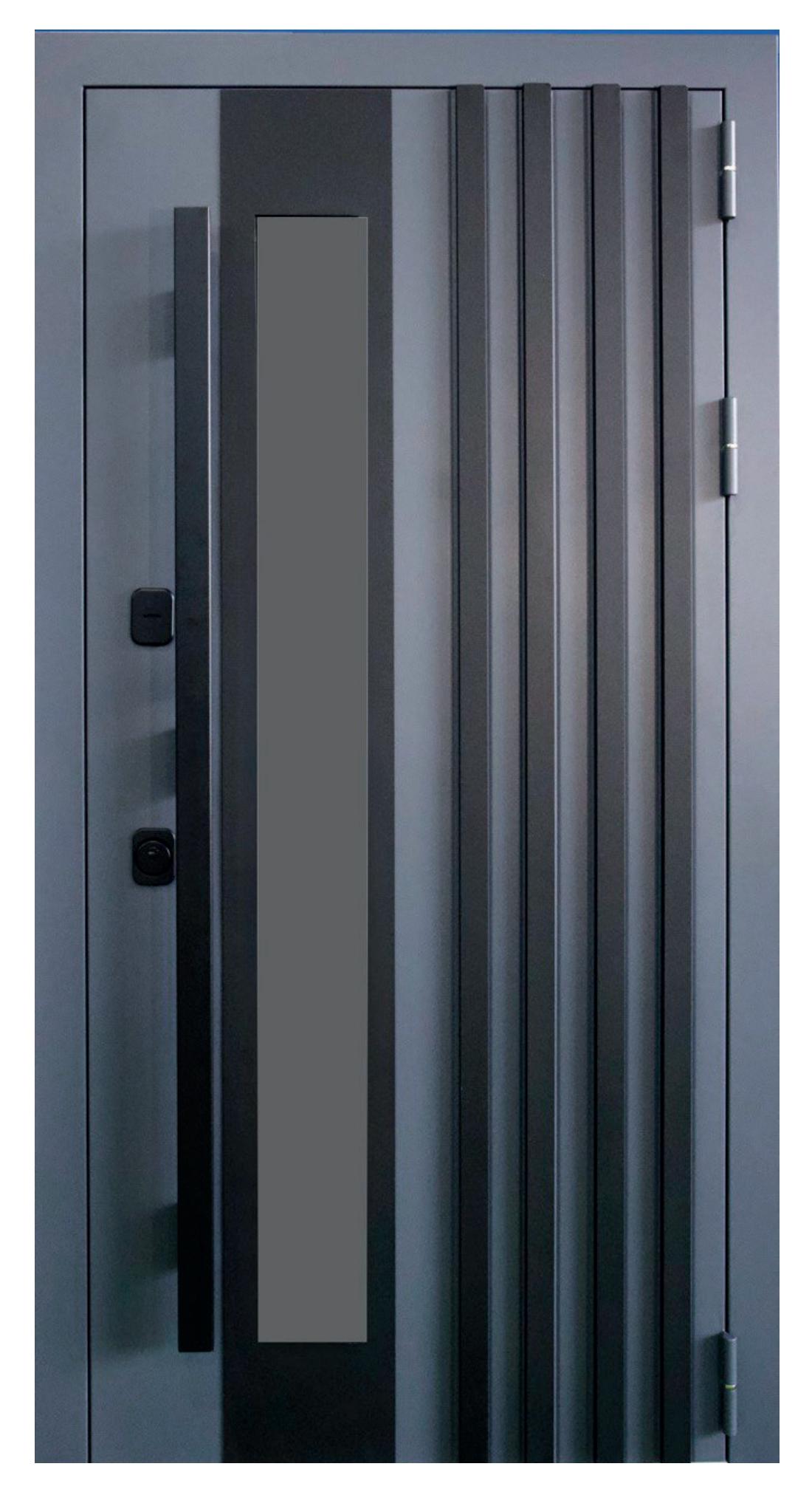цвет «Муар 7024», элемент накладной металл 2 мм Внутренняя панель: панель 10 мм, фрезерованная, ламинированная пленкой ПВХ «Велютто бьянко» Толщина металла: 1,4 мм Полотно: 110 мм, терморазрыв полиамидный профиль Стеклопакет: 2-х камерный толщиной 60 мм Наполнение: плита минераловатная IZOVOL СТ-50мм + ППС10-Р-А ГОСТ 15588-2014 + подложка МДФ 6мм Петли: 3 шт. каплевидные 140х20 на подшипнике, с общей допустимой нагрузкой 285 кг. Короб: открытый глубиной 150 мм, 3 контура уплотнения, терморазрыв 24 мм, полиамидный профиль Наличник: 80 мм Основной замок: цилиндровый Гардиан 3221 Дополнительный замок: сувальдный Гардиан 3001 Комплектация: ночная задвижка, фурнитура черная прямоугольная 17 серия, ручка штанга 1600 мм, декоративные накладки с защитой от продувания, порог с накладкой из нержавею- щей стали, комплект ключей. Размеры: 860х2060 мм/ 960х2060 мм