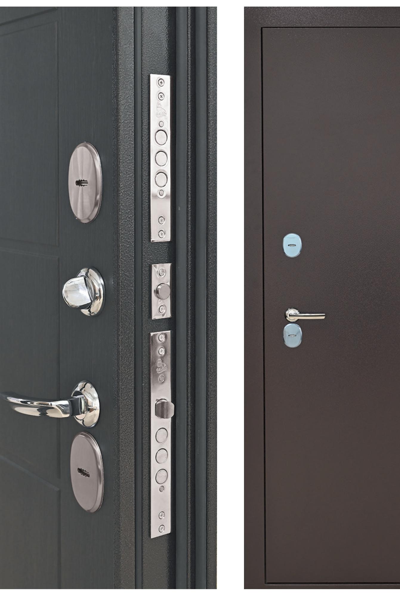 Внешняя отделка: порошково-полимерное покрытие, цвет «Медный антик» Внутренняя панель: панель 10 мм ламинированная пленкой ПВХ «Венге» Толщина металла: 1,4 мм Полотно: 110 мм, терморазрыв полиамидный профиль Наполнение: ППС10-Р-А-789х1200х1975 ГОСТ 15588-2014 + 6 мм ХДФ панель Петли: 3 шт. каплевидные 140х20 на подшипнике, с общей допустимой нагрузкой 285 кг. Короб: открытый с терморазрывом 24 мм, полиамидный профиль, глубиной 125 мм, 3 контура уплотнения Наличник: 75 мм Основной замок: сувальдный GALEON 818 (накладка с автоматической шторкой) Дополнительный замок: сувальдный GALEON 817 (накладка с автоматической шторкой) Комплектация: ночная задвижка, фурнитура хром овальная, декора- тивные накладк